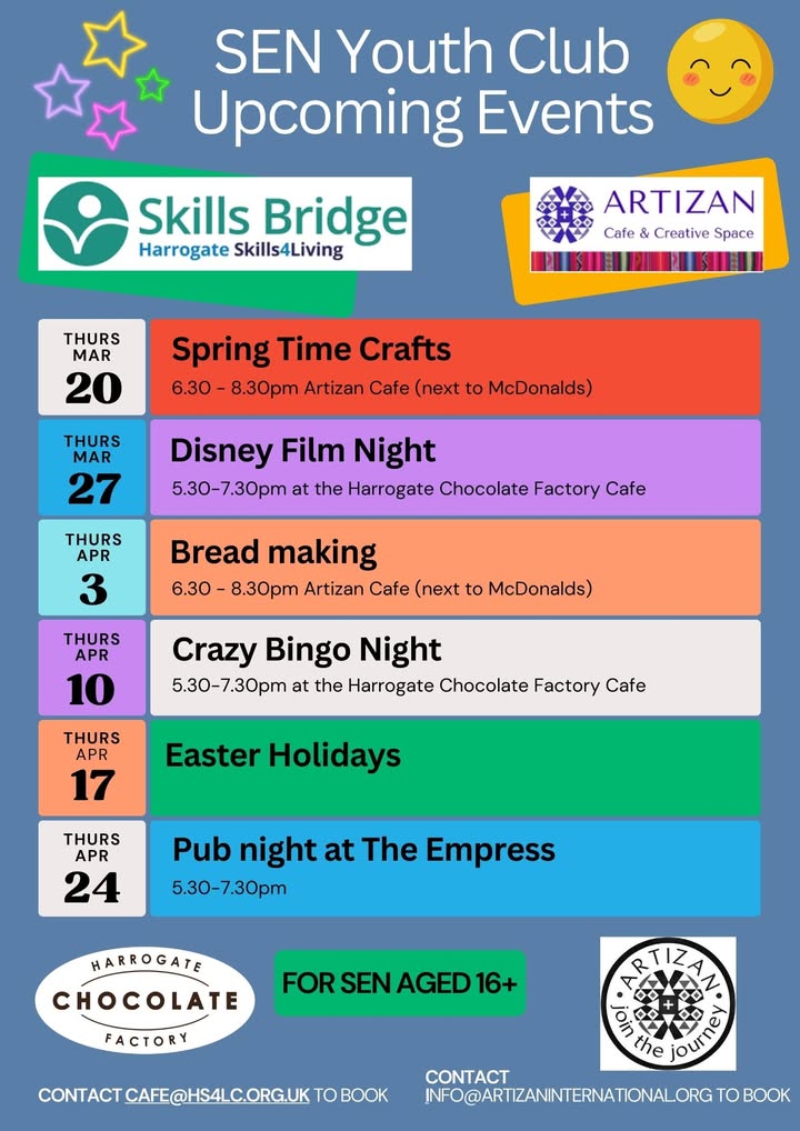 Skills Bridge by Harrogate Skills for Living and Artizan Café & Creative Space have come together to create a fantastic SEN Youth Club. Hosting multiple social nights each month, this inclusive space is designed for young people aged 16 and above to connect, have fun, and build friendships.